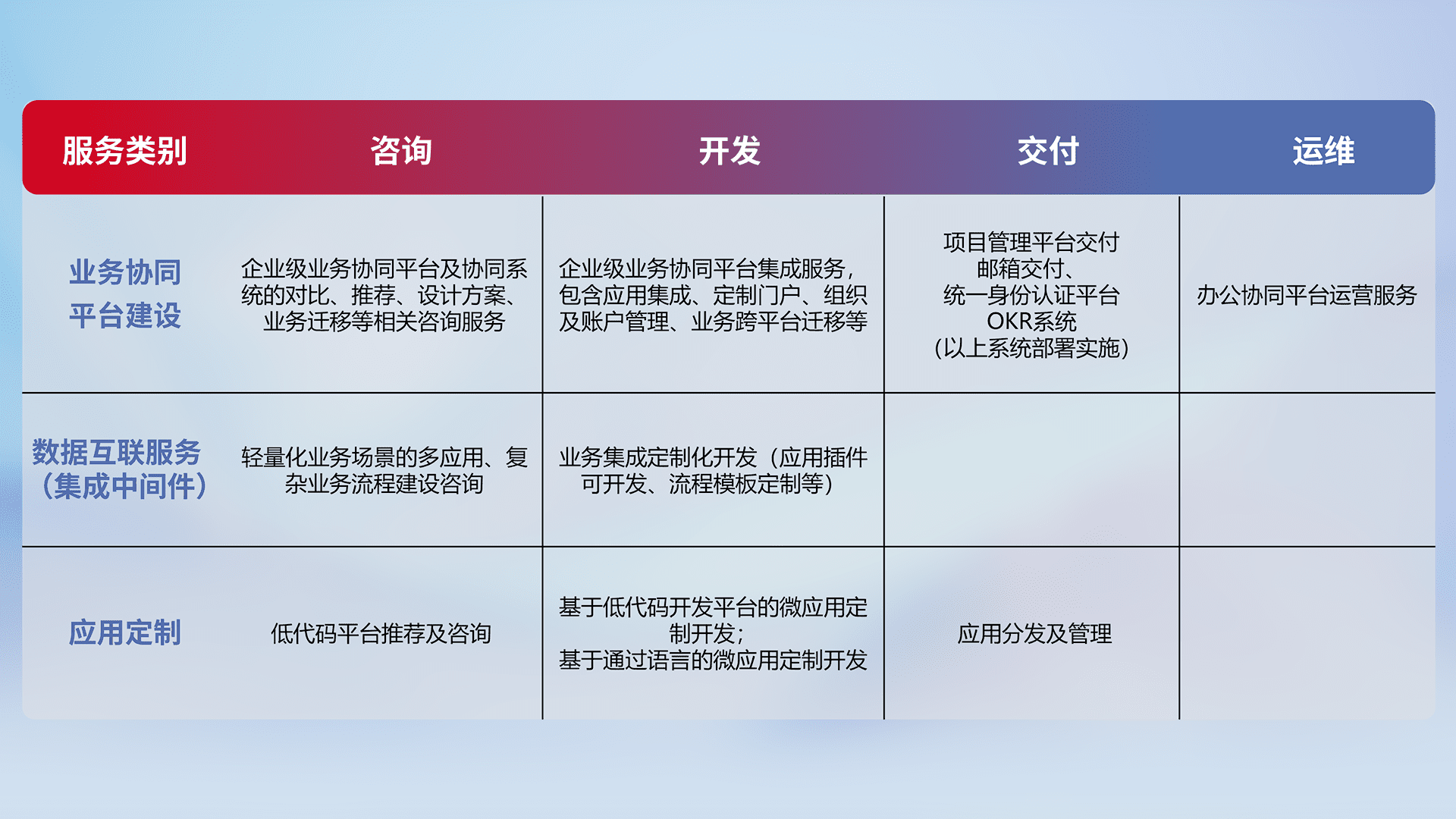 针对钉钉、、企微、、、IDaas等平台级产品提供产品的规划、、、方案、、、交付、、、定制化开发等服务,,,,实现如统一协同办公、、、智能客户服务、、、、混合会议管理、、、智能数据查询、、、、等业务场景,,实现数字化转型。。。。