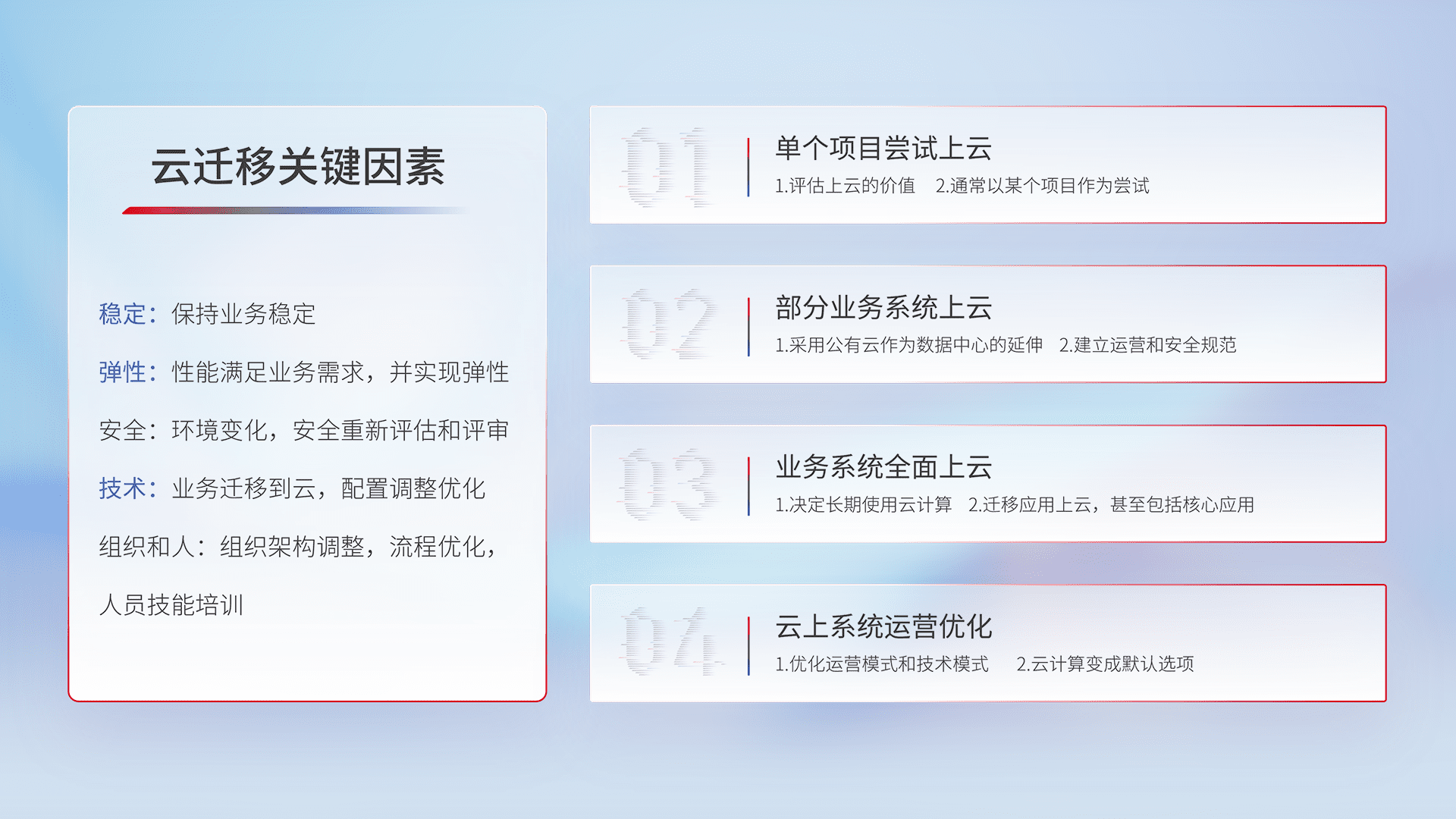 结合实际业务,,,从规划设计、、、、云平台选型、、云原生改造、、数据迁移、、、集成交付,,迁移全过程为客户识别最佳上云路径,,,,做好风险识别管理,,设计网络架构、、、身份权限、、安全审计合规、、、、操作审计、、、日志审计、、、、监控告警策略、、、、多站点容灾设计等,,,,对云上基础设施进行整体规划,,提升IT治理水平,,以满足弹性、、高可用、、、高性能的需求。。。。