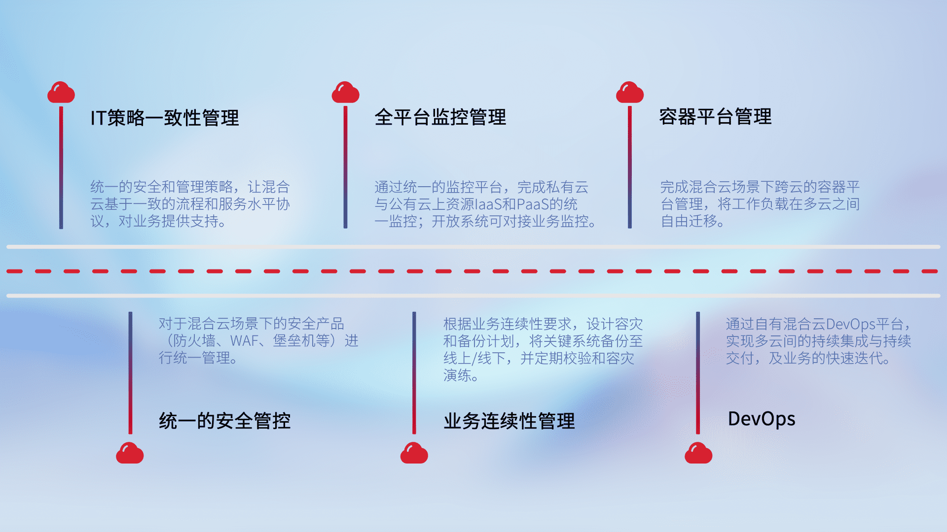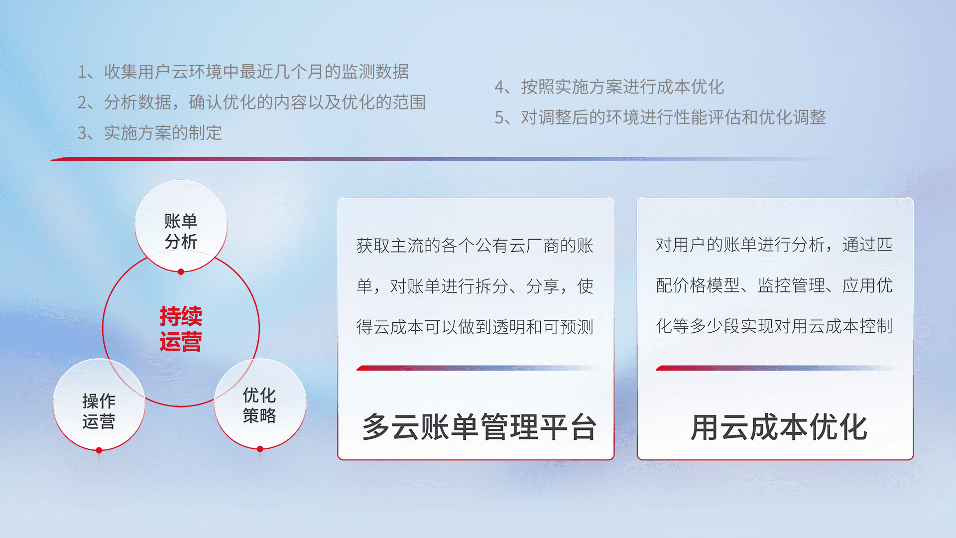 通过多云纳管,,,,以统一的资源数据模型把客户的云资源进行抽象和封装,,,进而实现对多云资源的统一操作,,,,保障云资源管理的可靠性、、、、稳定性与可用性。。。量身定制化运维内容,,,配置、、开发运维、、补丁管理、、、备份、、、、监控、、认证和访问管理、、审计和日常巡检等,,,,保障在用云过程中的可靠度,,,稳定度以及高可用率。。。。